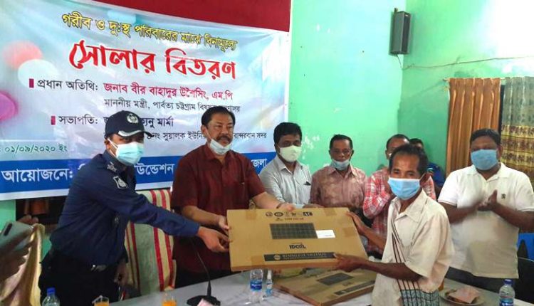 পার্বত্য চট্টগ্রাম বিষয়ক মন্ত্রণালয়ের মন্ত্রী বীর বাহাদুর উশৈসিং, এমপি বলেছেন, বর্তমান সরকার পার্বত্য চট্টগ্রামের প্রত্যন্ত অঞ্চলের কোন কুঁড়ে ঘরকেও অন্ধকারে রাখবে না। প্রধানমন্ত্রী শেখ হাসিনার এ উদ্যোগ সাধারন মানুষ আলোর ছোঁয়ায় থাকবে। মঙ্গলবার (১লা সেপ্টেম্বর) সকালে বান্দরবানের সুয়ালক ইউনিয়ন পরিষদে স্থানীয় বাসিন্দাদের মাঝে হোম সোলার সিস্টেম বিতরনের সময় প্রধান অতিথির বক্তব্যে তিনি এ কথা বলেন।