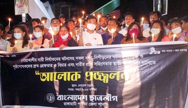 বেগমগঞ্জে গৃহবধূকে বিবস্ত্র করে বর্বর নির্যাতনের ঘটনাসহ সারাদেশে ঘটে যাওয়া একের পর এক ধর্ষণ নারী নিপীড়নের ঘটনায় সম্পৃক্ত ও পৃষ্ঠপোষকদের গ্রেপ্তার করে এর বিচার এবং নারীর প্রতি সহিংসতার স্থায়ী অবসানের দাবিতে রাঙ্গামাটিতে আলোক প্রজ্জ্বলন করেছে রাঙ্গামাটি জেলা ছাত্রলীগ।