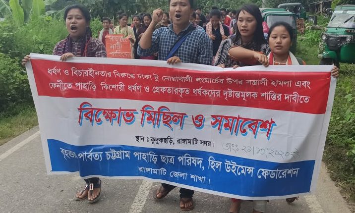 ধর্ষণ ও বিচারহীনতার বিরুদ্ধে ঢাকা টু নোয়াখালী লং মার্চের উপর সন্ত্রাসী হামলা এবং ফেনীতে পাহাড়ি তরুণী ধর্ষণকারীদের দৃষ্টান্তমূলক শাস্তির দাবিতে বিক্ষোভ মিছিল ও সমাবেশ করেছে বৃহত্তর পার্বত্য চট্টগ্রাম পাহাড়ি ছাত্র পরিষদ ও হিল উইমেন্স ফেডারেশন রাঙ্গামাটি জেলা শাখা। বুধবার (২১ অক্টোবর) সকাল ১১টায় রাঙ্গামাটি সদর উপজেলার কুদুকছড়িতে এই বিক্ষোভ মিছিল ও সমাবেশ অনুষ্ঠিত হয়।