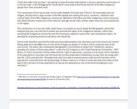 আন্তর্জাতিক মানবাধিকার সংগঠন এ্যামনেষ্টি ইন্টান্যশনাল বান্দরবানের চিম্বুকে ম্রো জাতি গোষ্টির চিরায়ত ভূমি থেকে জোরপূর্বক উচ্ছেদ করে পাঁচতারা হোটেল ও পার্ক নির্মাণে উদ্বেগ প্রকাশ করে ম্রো আদিবাসীদের সুরক্ষার আহ্বান জানিয়েছেন। সেই সাথে পার্বত্য চট্টগ্রাম বিষয়ক মন্ত্রণালয়ের মন্ত্রী বীর বাহাদুর উশেসিং, এমপি’র খোলা চিঠিও দিয়েছেন।