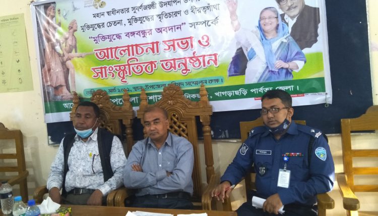 মহান স্বাধীনতার সুবর্ণজয়ন্তী উদযাপন উপলক্ষে যুক্তিযুদ্ধের চেতনা, মুক্তিযুদ্ধের স্মৃতিচারণ ও বীরত্বগাঁথা “মুক্তিযুদ্ধে বঙ্গবন্ধুর অবদান” সম্পর্কে মানিকছড়িতে আলোচনা সভা ও সাংস্কৃতিক অনুষ্ঠানের আয়োজন করা হয়েছে।