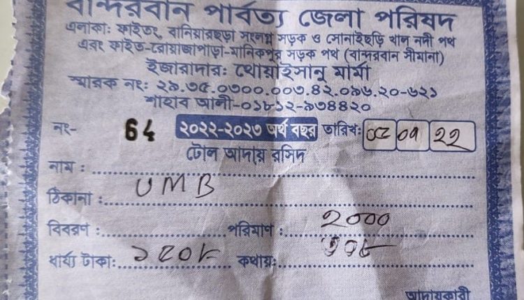 কিন্তু থোয়াইচানু মার্মা নামে কে বা কারা ইজারা আদায়ের রশিদ বই বানিয়ে টোল আদায় করে চলছে। ৫ জুলাই/২২ তারিখের একটি আদায় রিসিটে দেখা যায়। ২০২২-২০২৩ অর্থ বছরের জন্য করা রিসিটে, স্মারক নং উল্লেখ করা হয়েছে বিগত ২০২১-২০২২ অর্থ বছরের।