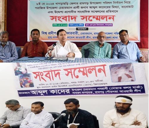 অপরদিকে মঙ্গলবার (১৪মে) সকালে গত ৬ষ্ঠ উপজেলা পরিষদ নির্বাচনে ১ম ধাপে খাগড়াছড়ির রামগড় উপজেলা পরিষদের পরাজিত প্রার্থী আব্দুল কাদের কর্তৃক মিথ্যা, বানোয়াট ও উদ্দেশ্য প্রণোদিত সাংবাদিক সম্মেলনের প্রতিবাদে খাগড়াছড়ি প্রেসক্লাবে পাল্টা সংবাদ সম্মেলন করেছেন রামগড় উপজেলা পরিষদের ২য় বারের মতো নির্বাচিত চেয়ারম্যান বিশ্ব প্রদীপ কুমার কারবারী। সংবাদ সম্মেলনে লিখিত বক্তব্যে বিশ্ব প্রদীপ কুমার কারবারী বলেন, গত ১২মে’২০২৪ খ্রিঃ তারিখ, রোজ-রোববার, সকাল সাড়ে ১০ ঘটিকায় ঢাকাস্থ বাংলাদেশ ক্রাইম রিপোর্টাস এসোসিয়েশন মিলনায়তনে পরাজিত প্রার্থী আব্দুল কাদের (দোয়াত কলম) সংবাদ সম্মেলনের মাধ্যমে নির্বাচনে অনিয়ম, কেন্দ্র দখল, ভোট জালিয়াতি এবং নির্বাচন পরবর্তীতে তার সমর্থকদের ওপর হামলা, বাড়িঘর ও ব্যবসা প্রতিষ্ঠানে লুটপাটসহ নির্বাচনে প্রভাব বিস্তারের মিথ্যা ও বানোয়াট অভিযোগ করেছেন।