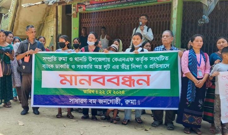রুমায় ব্যাংক ডাকাতি ও অস্ত্র লুটের প্রতিবাদে বম জনগোষ্ঠীর মানববন্ধন