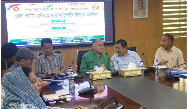 রাঙ্গামাটি পার্বত্য জেলা পরিষদ এর এনেক্স ভবনে জেলা মৎস্য অধিদপ্তরের আয়োজনে পার্বত্য চট্টগ্রাম অঞ্চলে মৎস্য সম্পদ উন্নয়ন প্রকল্পের আওতায় এ কর্মশালায় পরিষদ চেয়ারম্যান অংসুইপ্রু চৌধুরীর সভাপতিত্বে বিশেষ অতিথি ছিলেন, রাঙ্গামাটি জেলা পরিষদ সদস্য ও জেলা মৎস্য সম্পদ আহ্বায়ক অংসুইছাইন চৌধুরী, প্রকল্প পরিচালক মোঃ আবদুল্লা আল হাসান, জেলা মৎস্য অফিসার অধীর চন্দ্র দাস, অতিরিক্ত পুলিশ সুপার মোঃ জাহেদুল ইসলাম, জেলা পরিষদ সদস্য রেমলিয়ানা পাংখুয়া, সুবির কুমার চাকমাসহ জেলা পরিষদ সদস্য ও স্টেক হোল্ডার প্রতিনিধিগণ। রাঙ্গামাটি সদর উপজেলার সিনিয়র উপজেলা মৎস্য অফিসার শেখ মোঃ এরশাদ বিন শাহীদ’র সঞ্চালনা করেন।