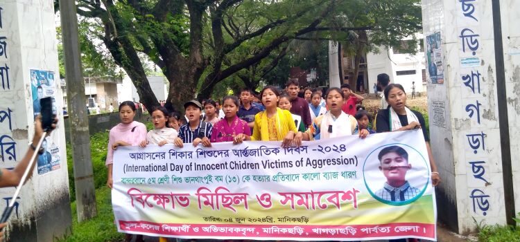 আগ্রাসনের শিকার শিশুদের আন্তর্জাতিক দিবস উপলক্ষে খাগড়াছড়ির মানিকছড়িতে বিক্ষোভ মিছিল ও সমাবেশ অনুষ্ঠিত হয়েছে। মঙ্গলবার (৪ জুন) সকাল সাড়ে ১০টার দিকে স্কুল-কলেজ শিক্ষার্থী ও অভিভাবকবৃন্দদের ব্যানারে উক্ত বিক্ষোভ মিছিল ও সমাবেশ অনুষ্ঠিত হয়। মিছিলটি মানিকছড়ি গিরি মৈত্রী সরকারি ডিগ্রি সরকারি কলেজ থেকে শুরু করে খাগড়াছড়ি-চট্টগ্রাম সড়কের উপজেলা পরিষদ প্রদক্ষিণ করে কলেজ সংলগ্ন সড়কে সমাবেশে মিলিত হয়। এসময় বান্দরবানে ৫ম শ্রেণির শিশু ভানথাংপুই বম (১৩) কে হত্যার প্রতিবাদে কালো ব্যাজ ধারণ করা হয়।