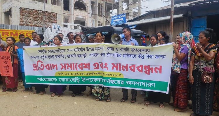 রোয়াংছড়িতে কেএনএফ এর বিরুদ্ধে প্রতিবাদ সমাবেশ ও মানববন্ধন