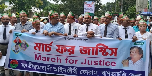 ন্যায়বিচার প্রতিষ্ঠা ও মানবাধিকার রক্ষার দাবিতে কেন্দ্রীয় কর্মসূচির অংশ হিসেবে ‘মার্চ ফর জাস্টিস’ কর্মসূচি পালন করেছে জাতীয়তাবাদী আইনজীবী ফোরাম। বৃহস্পতিবার (৪১জুলাই) সকালে খাগড়াছড়ি জেলা আইনজীবী সমিতি চত্বর থেকে একটি পদযাত্রা বের হয়ে শহরের প্রধান সড়ক প্রদক্ষিণ করে প্রেসক্লাব প্রাঙ্গণে এসে প্রতিবাদ সমাবেশের মাধ্যমে কর্মসূচির সমাপ্তি ঘটে।