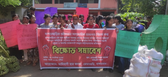 খাগড়াছড়িতে এক ছাত্রীকে গণধর্ষনের ঘটনার প্রতিবাদে শান্তিপূর্ণ অবরোধ কর্মসুচী পালনকালে সেটেলার বাঙালী কর্তৃক জুম্মদের উপর পরিকল্পিত সন্ত্রাসী হামলা ও ঘরবাড়ি সহ দোকানপাট ভাঙচুর-অগ্নিসংযোগের প্রতিবাদে রোয়াংছড়িতে আদিবাসী ছাত্র জনতার আয়োজনে বিক্ষোভ সমাবেশ অনুষ্ঠিত হয়। সোমবার (২৯সেপ্টেম্বর) উসারা মহাথের লাইব্রেরি সামনে মাঠ প্রাঙ্গণে এ প্রতিবাদ ও বিক্ষোভ সমাবেশে অনুষ্ঠিত হয়।