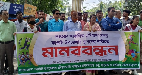বিকেএসপি আঞ্চলিক প্রশিক্ষণ কেন্দ্র কাপ্তাইয়ে স্থাপনের দাবিতে মানববন্ধন