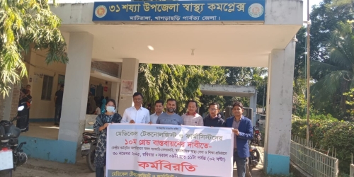 রবিবার (৩০নভেম্বর ) সকাল ৯টা থেকে ১১টা পর্যন্ত বাংলাদেশ মেডিকেল টেকনোলজিস্ট অ্যালায়েন্স (বিএমটিএ)-এর ব্যানারে উপজেলা স্বাস্থ্য কমপ্লেক্সের সামনে এ কর্মসূচি পালিত হয়।