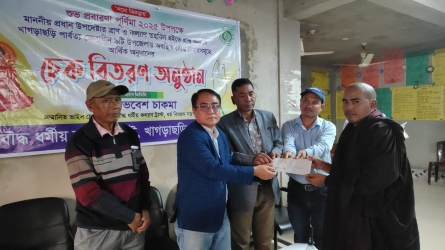 খাগড়াছড়ি পার্বত্য জেলার ৯টি উপজেলার বৌদ্ধ বিহারসমূহে বিতরণ শুরু হয়েছে শুভ প্রবারণা পূর্ণিমা উপলক্ষে প্রধান উপদেষ্টার ত্রাণ ও কল্যাণ তহবিল থেকে প্রাপ্ত অনুদান। এর অংশ হিসেবে গুইমারা ও মাটিরাঙ্গা উপজেলার বৌদ্ধ বিহারগুলোতে আর্থিক অনুদানের চেক বিতরণ করা হয়েছে।