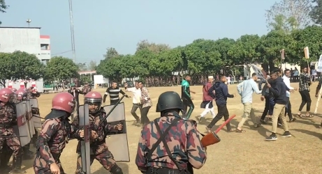 অনুশীলনে প্রতীকি দেখানো হয়, জারুলছড়ি ভোট কেন্দ্রে ব্যালট বাক্স ছিনতাইয়ের ঘটনা ঘটলে পুলিশ সদস্য কর্তৃক তাৎক্ষণিকভাবে প্রিজাইডিং অফিসারকে অবহিত করা হয়। পুলিং অফিসার মোবাইল ফোনের মাধ্যমে নির্বাহী ম্যাজিস্ট্রেটের কাছে আইন-শৃঙ্খলা রক্ষাকারী বাহিনীর সহায়তা কামনা করেন। একই সঙ্গে জাল ভোট প্রদান ও ব্যালট বাক্স ছিনতাইয়ের বিষয়ে দলীয় এজেন্টদের মাধ্যমে প্রার্থী ও সাংবাদিকদের অবহিত করার দৃশ্যও মহড়ায় অন্তর্ভুক্ত ছিল। পরবর্তীতে পিকআপ ভ্যানে করে বিজিবি’র টহল দল দ্রুত ঘটনাস্থলে পৌঁছায়। মাঠের দুই পাশ দিয়ে টহল দলের আগমন, ব্যালট বাক্স ছিনতাইকারীকে আটক, বিজিবি সদস্য ও বিশৃঙ্খলাকারীদের মধ্যে কথোপকথন এবং পরিস্থিতি নিয়ন্ত্রণের দৃশ্য অনুশীলন করা হয়। মহড়ায় আরও দেখানো হয় বিশৃঙ্খলাকারী দলীয় প্রার্থীর সঙ্গে নির্বাহী ম্যাজিস্ট্রেটের আলোচনা এবং সমস্যা সমাধানের জন্য প্রয়োজনীয় উদ্যোগ নিয়ে সমাধান করেন।