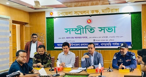 খাগড়াছড়ির মাটিরাঙ্গা উপজেলায় সাম্প্রদায়িক সম্প্রীতি বজায় রাখা এবং স্থানীয় স্থিতিশীলতা রক্ষায় সকল পর্যায়ের অংশীজনদের নিয়ে “সম্প্রীতি সভা” অনুষ্ঠিত হয়েছে। বুধবার (১১ মার্চ) সকালে মাটিরাঙ্গা উপজেলা অডিটোরিয়ামে অনুষ্ঠিত সভায় উপজেলা নির্বাহী অফিসার মাহমুদুর রহমানের সভাপতিত্বে প্রধান অতিথি হিসেবে উপস্থিত ছিলেন খাগড়াছড়ির জেলা প্রশাসক মোঃ আনোয়ার সাদাত।