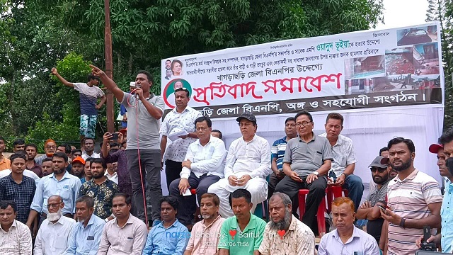 খাগড়াছড়ি জেলা বিএনপির সভাপতি ও সাবেক এমপি ওয়াদুদ ভূইয়ার বাড়ি ও গাড়িতে হামলা-ভাংচুরের প্রতিবাদে জেলা বিএনপি, অঙ্গ ও সহযোগী সংগঠন প্রতিবাদ সমাবেশ করেছে। সোমবার (৬জুন) সকালে জেলা শহরের ভাঙ্গাব্রীজ এলাকার গণপূর্ত অফিসের সম্মুখে এ প্রতিবাদ সমাবেশে জেলা বিএনপিসহ, অঙ্গ ও সহযোগী সংগঠন এতে অংশ নেন।