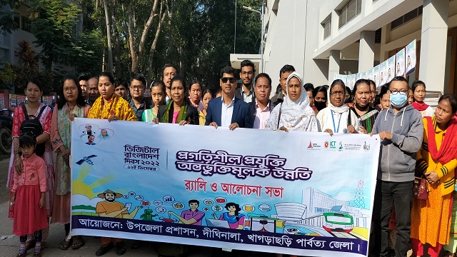 প্রগতিশীল প্রযুক্তি অন্তর্ভূক্তিমূলক উন্নতি প্রতিপাদ্য বিষয় ধারন করে ডিজিটাল বাংলাদেশ দিবস উপযাপন উপলক্ষে খাগড়াছড়ির দীঘিনালায় র্যালি ও আলোচনা সভা করা হয়েছে।
