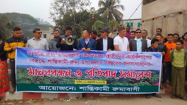 রুমায় কেএনএফ সন্ত্রাসীদের কার্যকলাপের বিরুদ্ধে শান্তিকামী রুমাবাসীর মানববন্ধন ও প্রতিবাদ