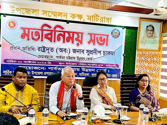 মঙ্গলবার (১০অক্টোবর) সকালের দিকে মাটিরাঙ্গা উপজেলা পরিষদ সম্মেলন কক্ষে প্রশাসনিক কর্মকর্তা, জনপ্রতিনিধি, রাজনৈতিক নেতৃবৃন্দ এবং সুশীল নাগরিক সমাজের সাথে মতবিনিময় সভায় এসব কথা বলেন সুপ্রদীপ চাকমা। মাটিরাঙ্গা উপজেলা পরিষদ ও উপজেলা প্রশাসনের সহযোগিতায় পার্বত্য চট্রগ্রাম উন্নয়ন বোর্ড এ মতবিনিময় সভার আয়োজন করে।