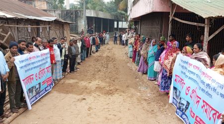 মানববন্ধনে বক্তব্যকালে অত্র এলাকার ইউপি সদস্য করিম বলেন, আমরা বারবার উপজেলা প্রকৌশলীকে কাজের তাগিদ দিয়েছি। কিন্তু উপজেলা প্রকৌশলী ও ঠিকাদারের গাফিলতির কারণে অত্র এলাকার জন-দুর্ভোগ বেড়েই চলছে। তিনি আরো বলেন আমাদের রাস্তাটি কাজ সম্পন্ন করতে না পারলে আমাদের রাস্তার পূর্বের ন্যায় ইটসোলিং বিছিয়ে দিন।