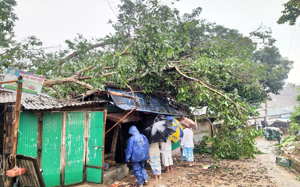 প্রবল বৃষ্টিপাতের ফলে ঘরের চালার উপর গাছ পড়ে ২টি দোকান ঘর সহ ৫ টি বসতবাড়ি সম্পুর্ণ বিধ্বস্থ হয়ে গেছে।